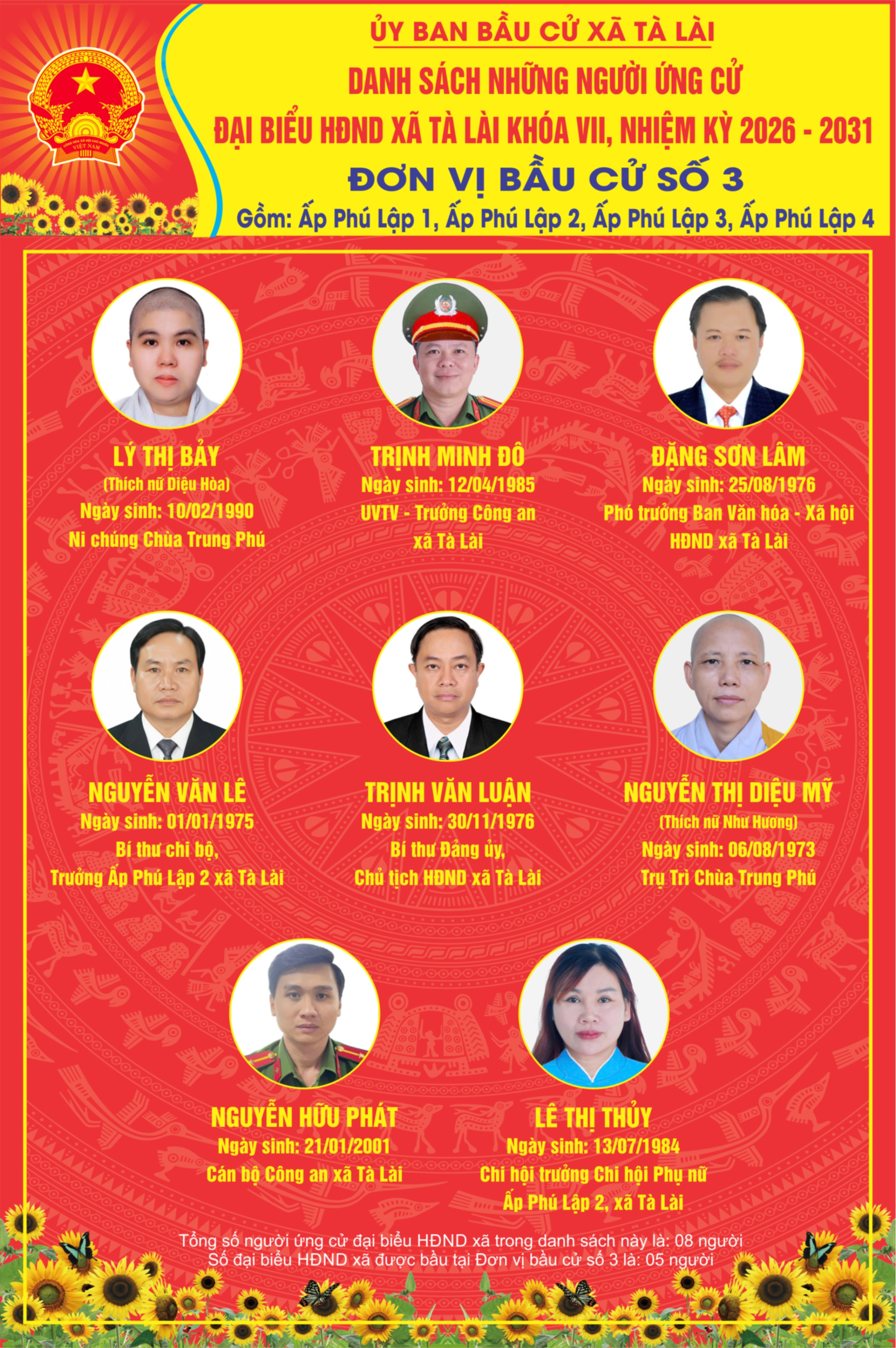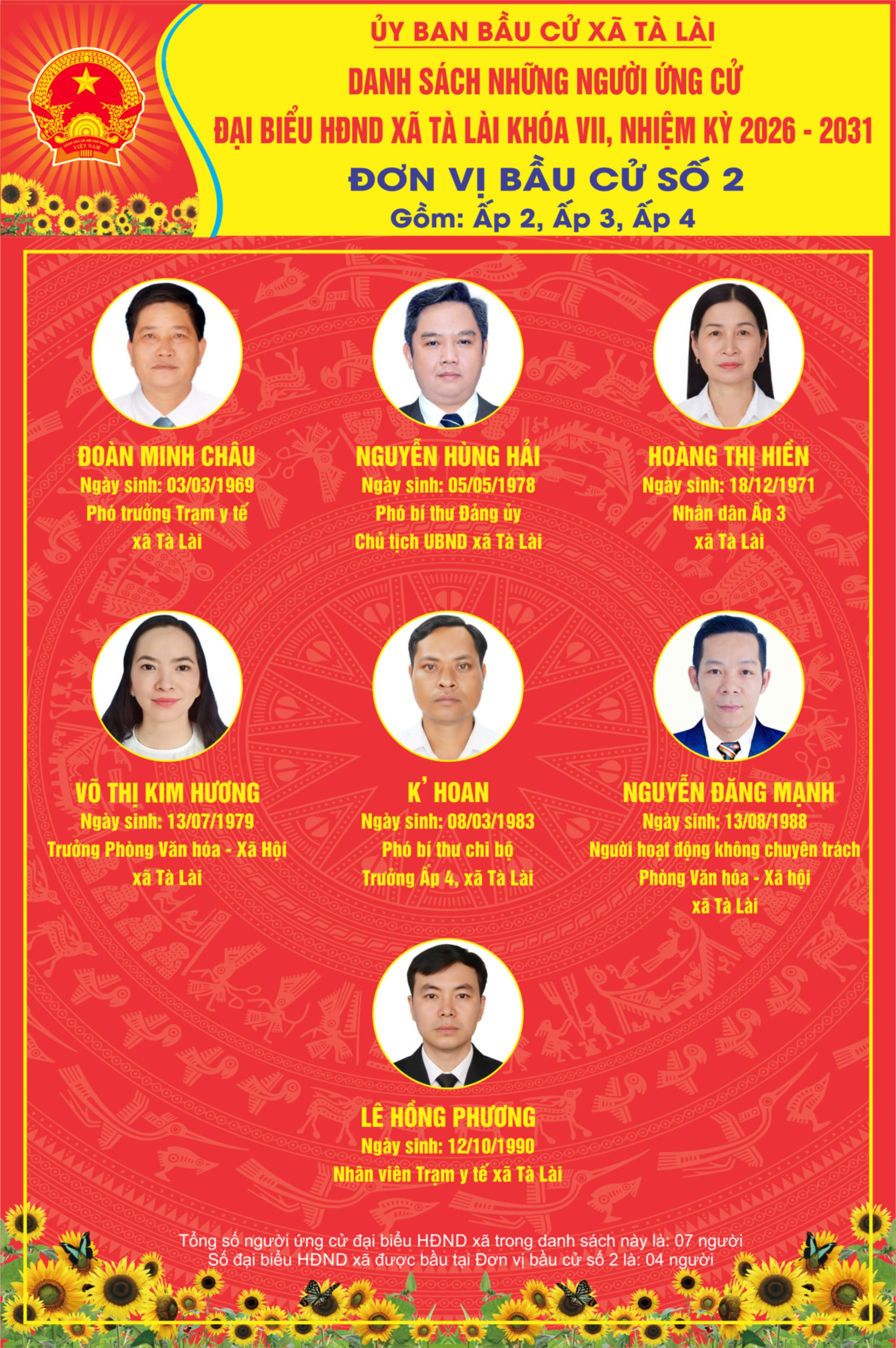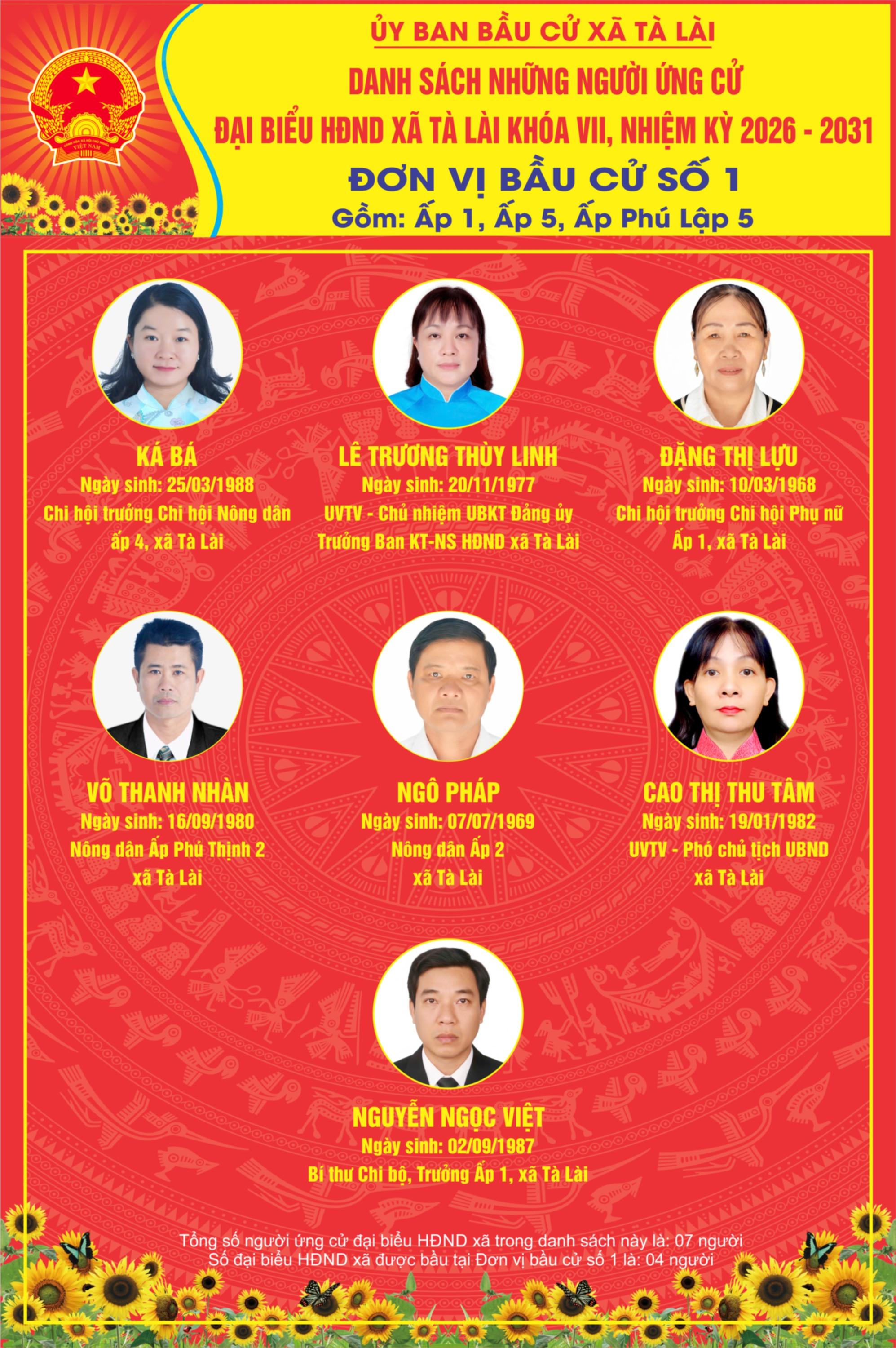 Uỷ ban bầu cử xã Tà Lài giới thiệu danh sách ứng cử viên ứng cử đại biểu Hội đồng nhân dân xã Tà Lài nhiệm kỳ 2026-2031.Xã Tà Lài có 06 Đơn vị Bầu cử, phân chia thành 19 Khu vực bỏ phiếu (tương ứng 19 ấp trên địa bàn).- Tổng số Ứng cử viên là: 37 người.- Số đại biểu HĐND xã Tà Lài được bầu là: 22 đại biểu.