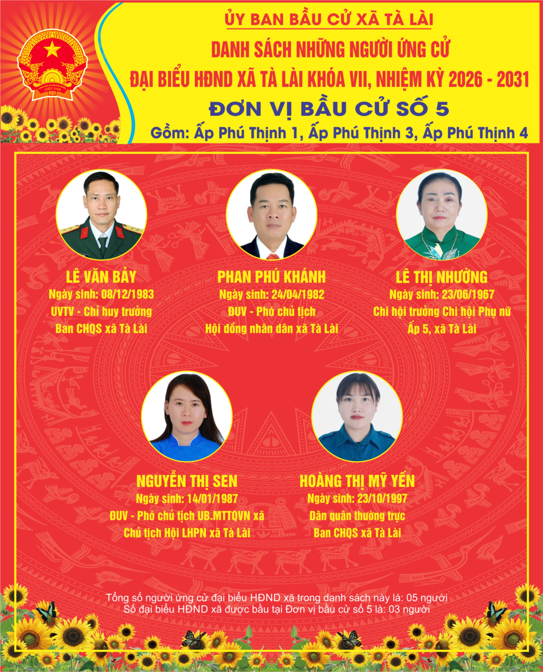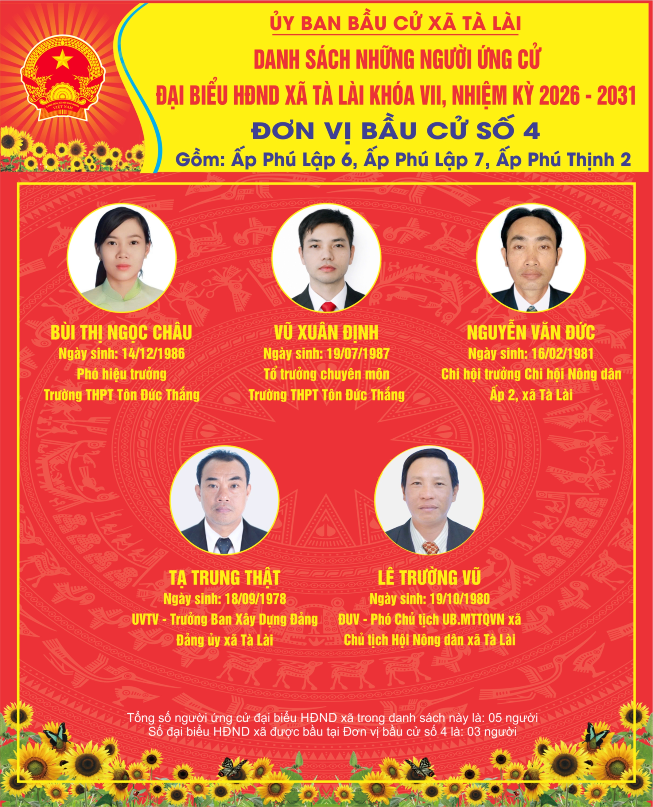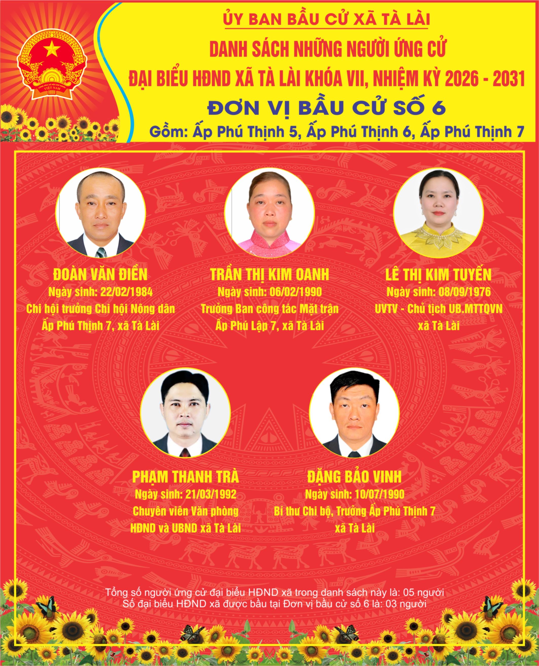 Uỷ ban bầu cử xã Tà Lài giới thiệu danh sách ứng cử viên ứng cử đại biểu Hội đồng nhân dân xã Tà Lài nhiệm kỳ 2026-2031.Xã Tà Lài có 06 Đơn vị Bầu cử, phân chia thành 19 Khu vực bỏ phiếu (tương ứng 19 ấp trên địa bàn).- Tổng số Ứng cử viên là: 37 người.- Số đại biểu HĐND xã Tà Lài được bầu là: 22 đại biểu.