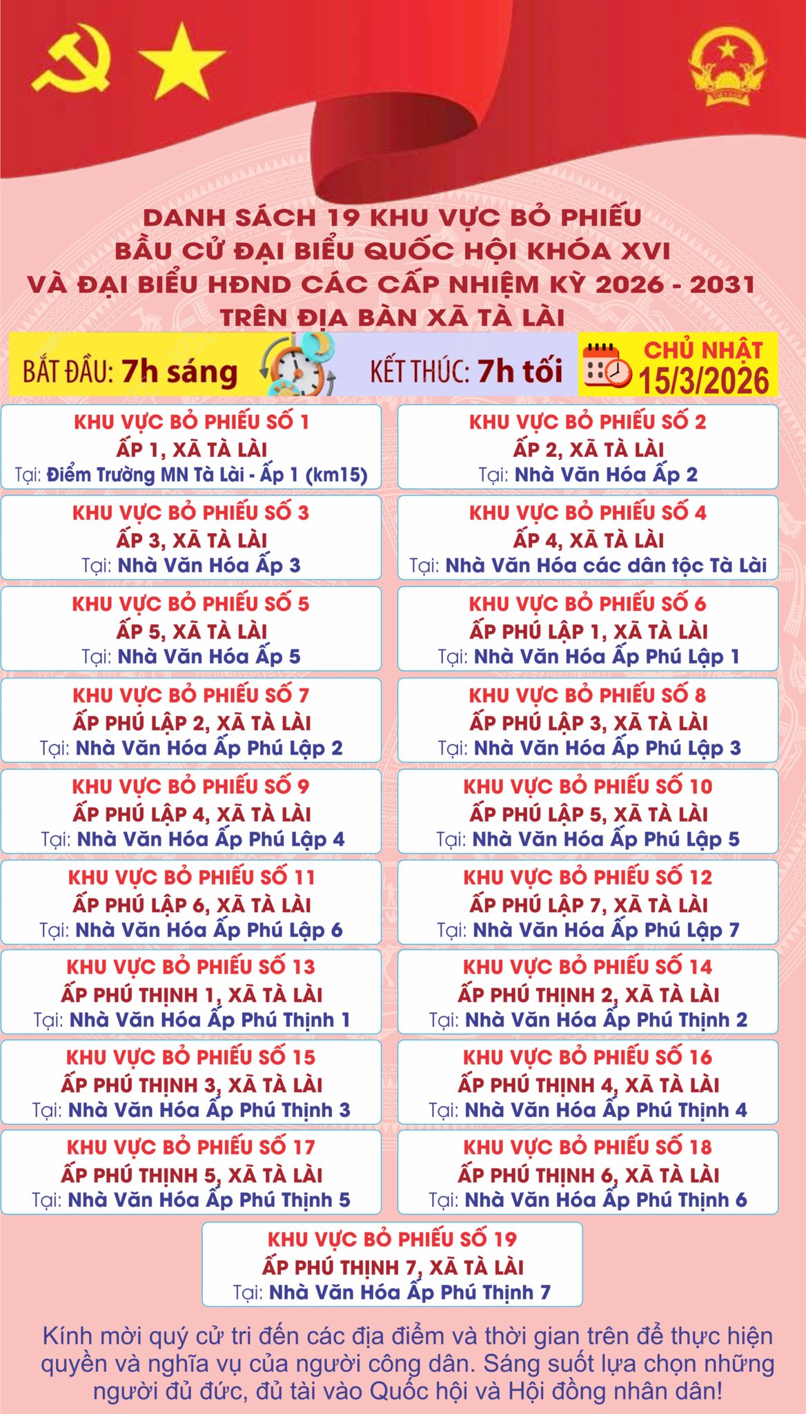 Cử tri căn cứ khu vực bỏ phiếu nơi mình cư trú để đến đúng địa điểm đã được niêm yết tại địa phương. Đây là quyền lợi và nghĩa vụ của mỗi cử tri. Ủy ban bầu cử xã Tà Lài đề nghị toàn thể cử tri trên địa bàn xã sắp xếp thời gian, tích cực tham gia bỏ phiếu đầy đủ, đúng thời gian quy định, góp phần vào thành công của cuộc bầu cử.