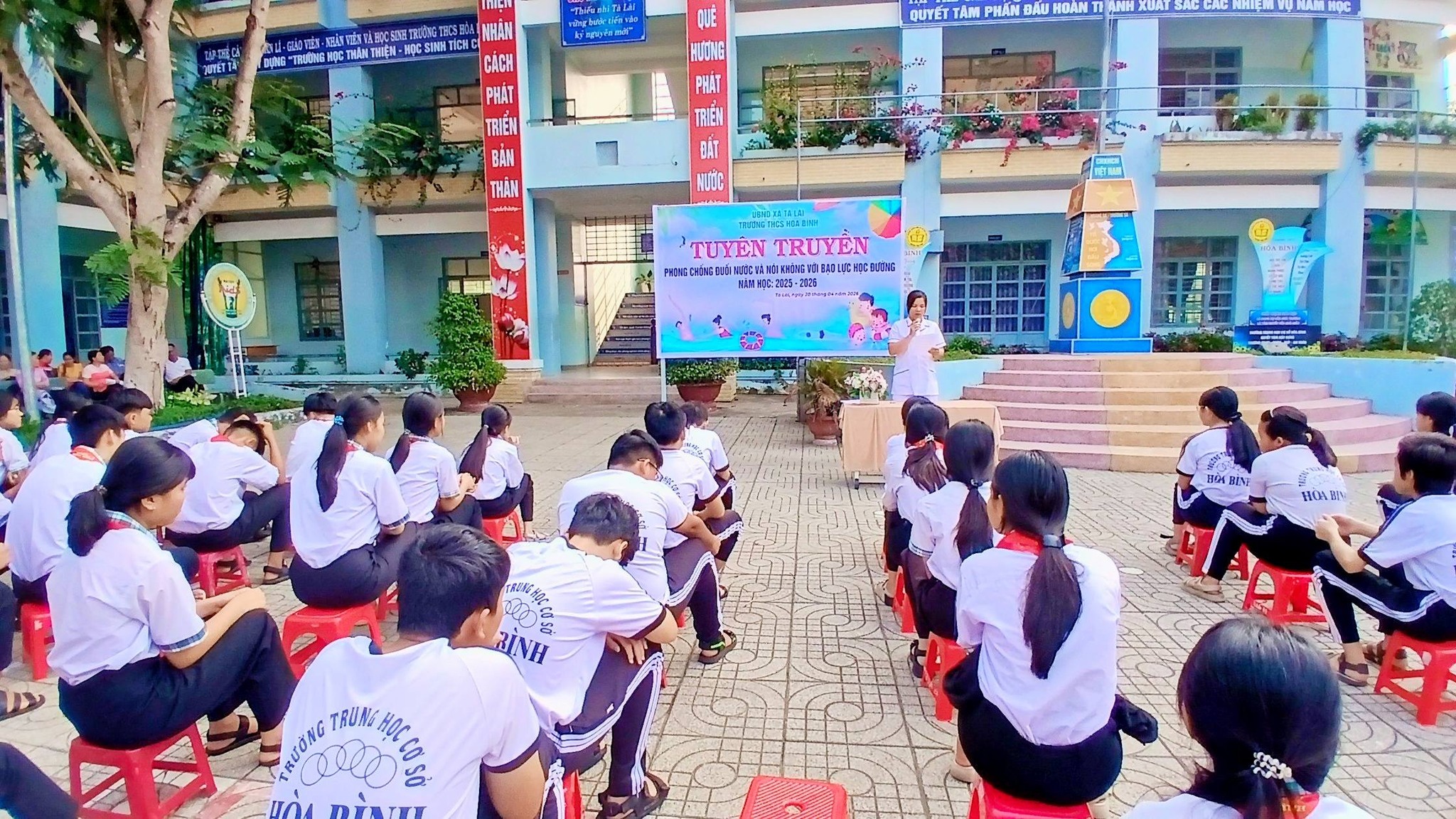Sáng ngày 20/4/2026, Trường THCS Hòa Bình đã tổ chức buổi tuyên truyền về phòng, chống đuối nước và bạo lực học đường với sự tham gia của toàn thể cán bộ, giáo viên, nhân viên và học sinh trong nhà trường.
