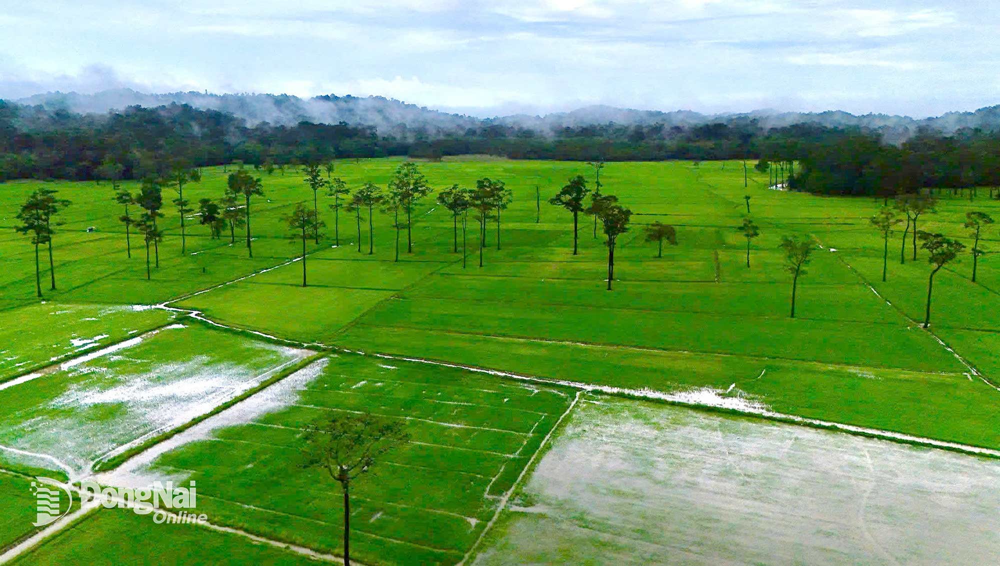 Từ trên cao, cánh đồng Tà Lài như tấm thảm khổng lồ được dệt từ màu xanh của lúa, của rừng. Ảnh: Thủy Tiên