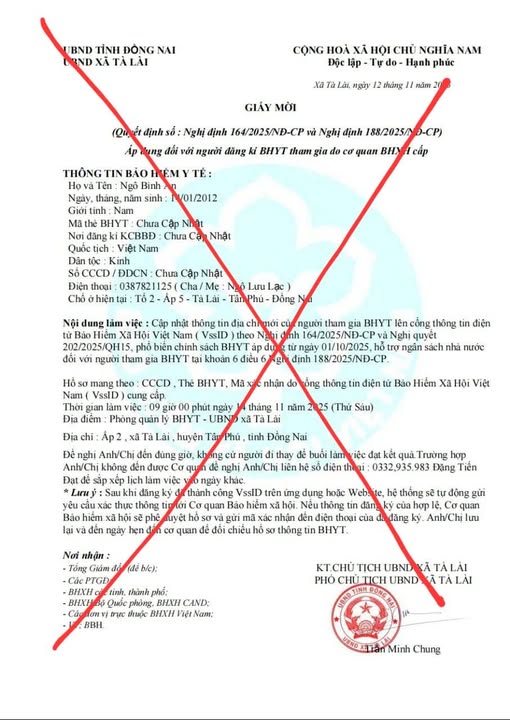 Vì: xã Tà Lài không có Phó chủ tịch tên Trần Minh Chung và UBND xã không phát hành thư mời để mời người dân đến UBND xã cập nhật thông tin BHYT.