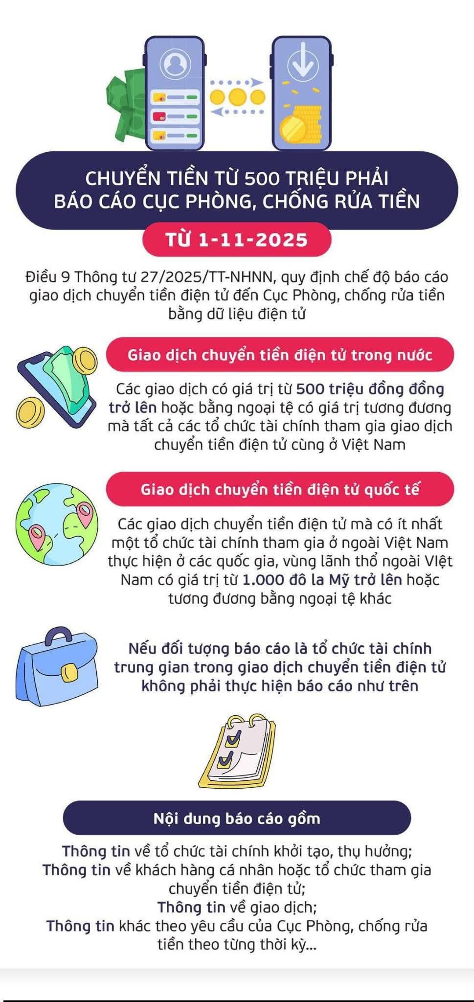 3. Từ ngày 1/11/2025, chuyển tiền từ 500 triệu đồng trở lên phải báo cáo Cục Phòng, chống rửa tiền