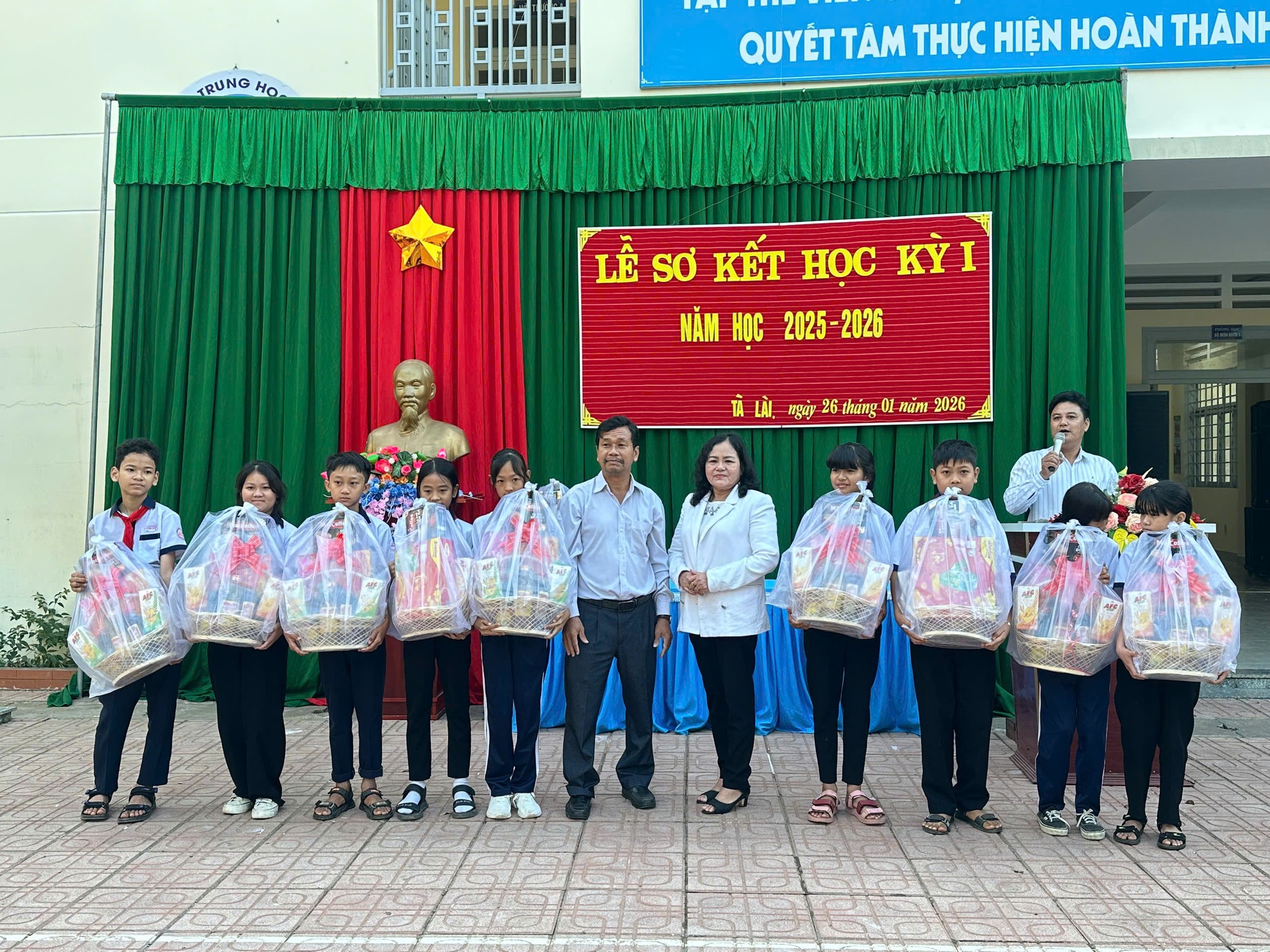 Cùng dịp này, cô Nguyễn Thị Kim Lan – cựu giáo viên đã nghỉ hưu, đại diện các mạnh thường quân, đã trao 20 phần quà Tết cho 20 học sinh có hoàn cảnh đặc biệt khó khăn. Những phần quà tuy giá trị vật chất không lớn nhưng chứa đựng tình cảm, sự quan tâm và sẻ chia, góp phần giúp các em và gia đình đón Tết thêm ấm áp, đủ đầy.