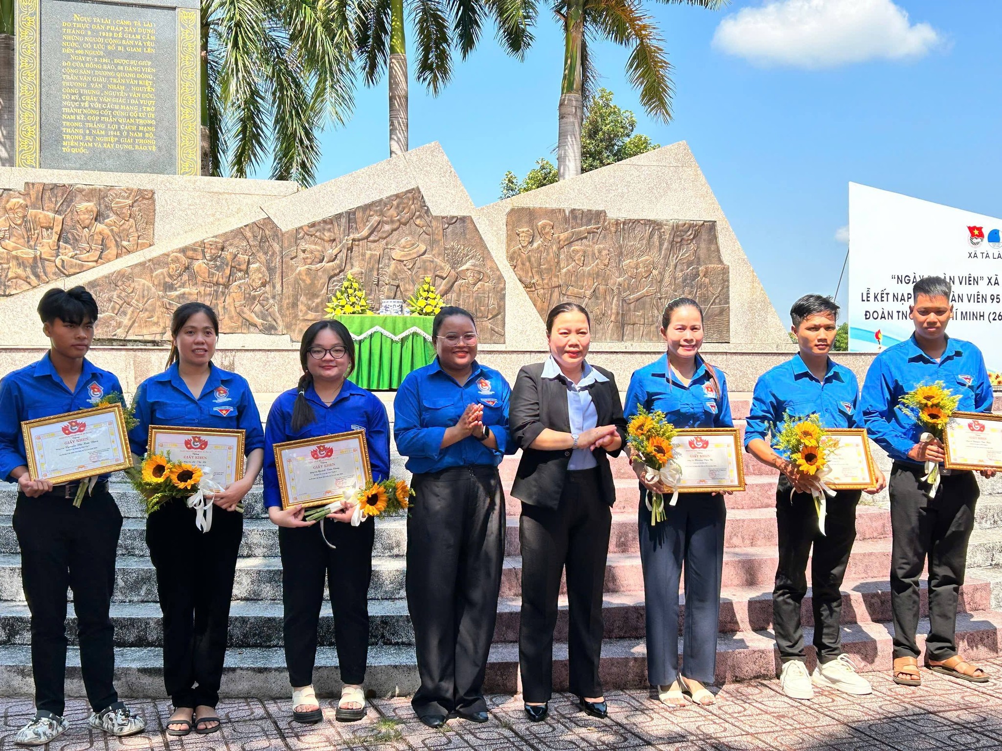 Bà Lê Thị Kim Tuyến, Chủ tịch Uỷ ban Mặt trận Tổ quốc Việt Nam xã tặng giấy khen cho các cá nhân có thành tích tiêu biểu trong công tác Đoàn và thanh thiếu nhi