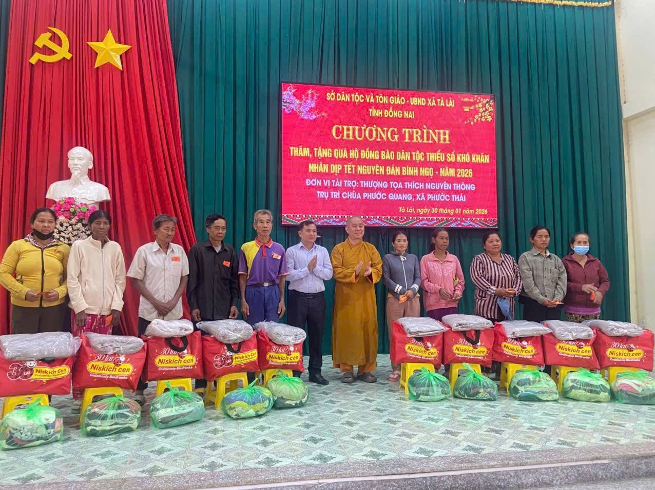 Sở Tôn giáo và Dân tộc tỉnh phối hợp với nhà tài trợ là Thượng tọa Thích Nguyên Thông – Trụ trì chùa Phước Quang (xã Phước Thái, tỉnh Đồng Nai) tặng quà cho hộ nghèo xã Tà Lài