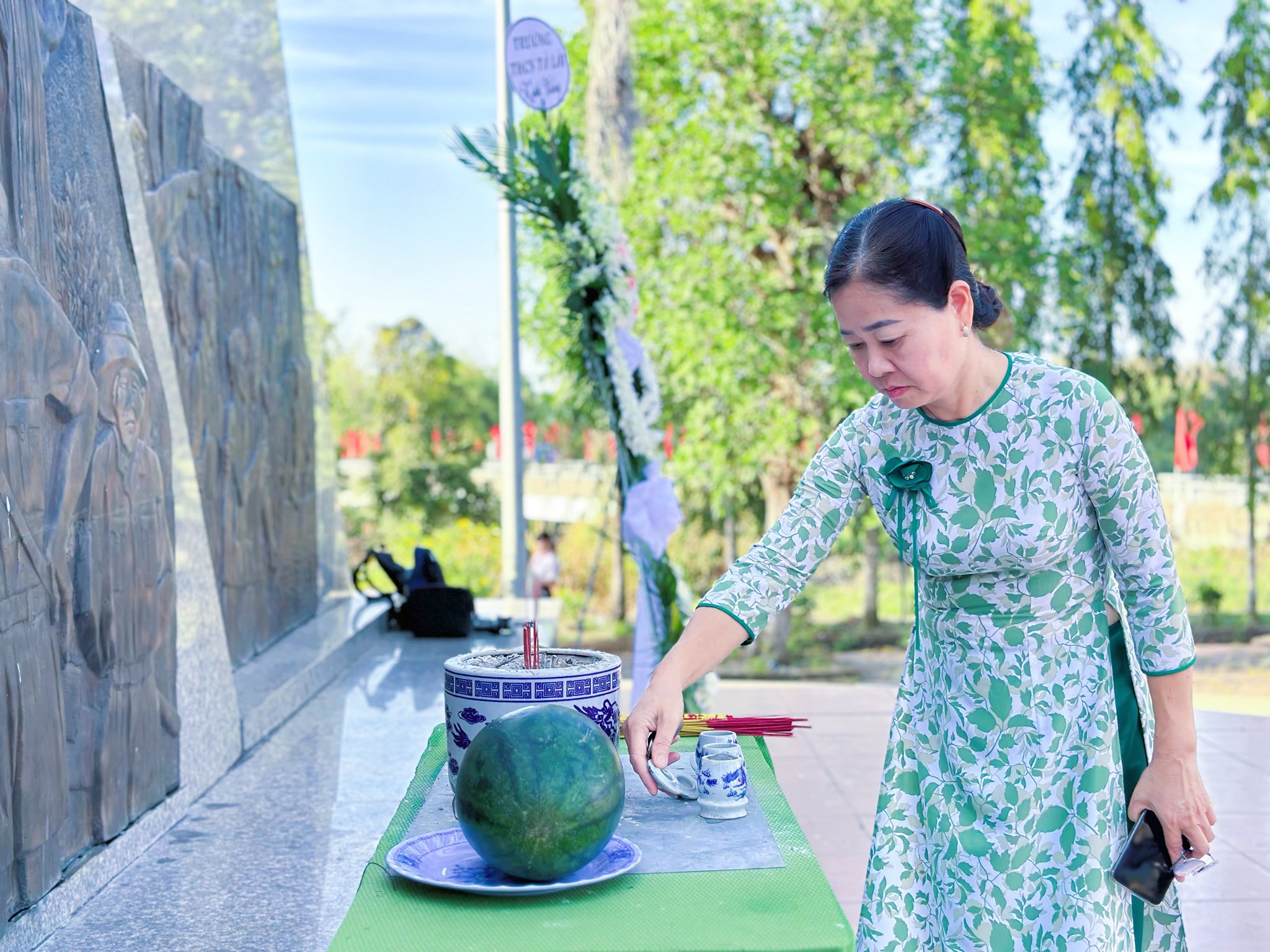 Cô Trương Thị Khuyên, Hiệu trưởng trường THCS Tà Lài chuẩn bị dâng hương tri ân những anh hùng liệt sĩ đã hy sinh vì nền độc lập dân tộc